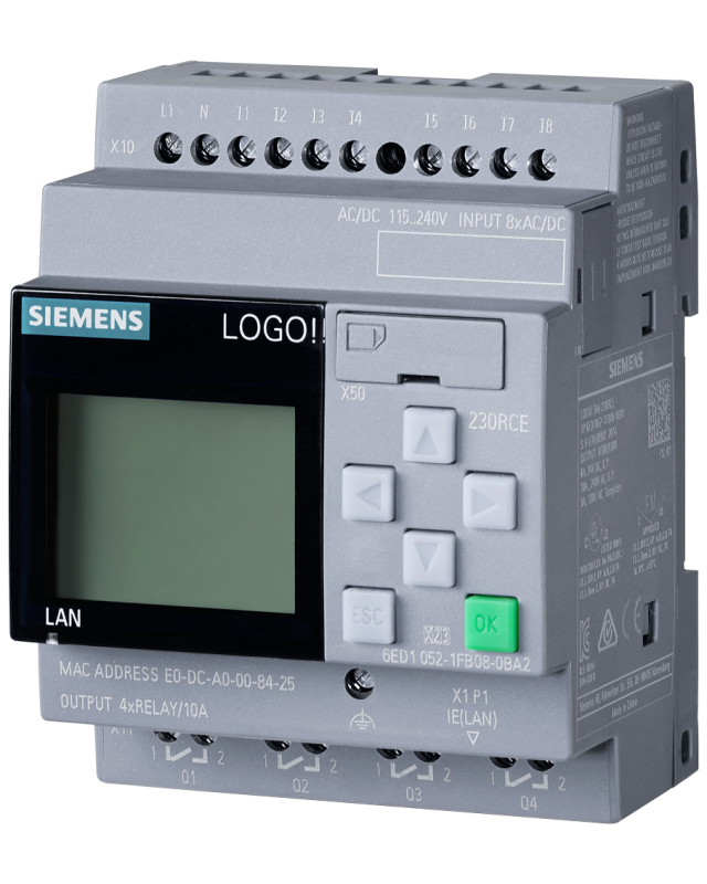 LOGO! 230RCE,logic module, display power supply / I/O: 115 V/230 V/relay, 8 DI/4 DO, memory 400 blocks, modularly expandable, Ethernet, integrated web server, data log, user-defined web pages, standard microSD card for LOGO! Soft Comfort V8.4 or higher, older projects executable cloud connection, MQTT in all LOGO! 8.4 basic units