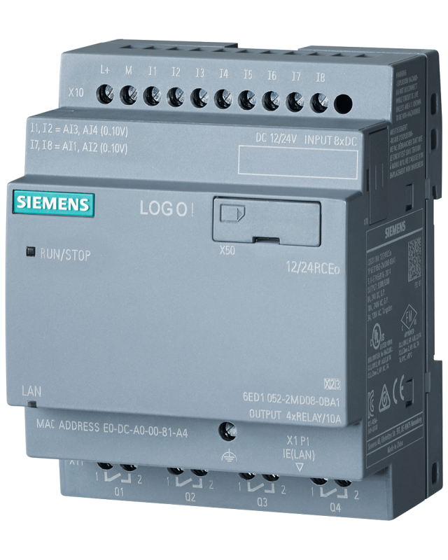 LOGO! 12/24RCEO, logic module, power supply / I/O: 12/24 V DC/relay, 8 DI (4 AI)/4 DO, without display, memory 400 blocks, modularly expandable, Ethernet, integrated web server, data log, user-defined web pages, standard microSD card for LOGO! Soft Comfort V8.4 or higher, older projects executable cloud connection, MQTT in all LOGO! 8.4 basic units
