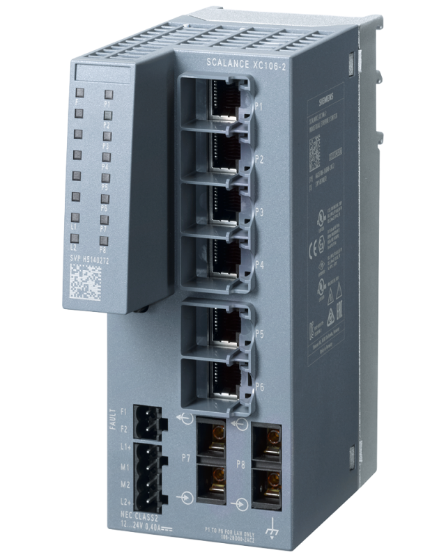 6GK5106-2BD00-2AC2 | SCALANCE XC106-2, Unmanaged IE switch, 6x 10/100 Mbit/s RJ45 ports, 2x 100 Mbit/s Multimode SC, LED diagnostics, error-signaling contact with set button, redundant Power supply Manual available as a download